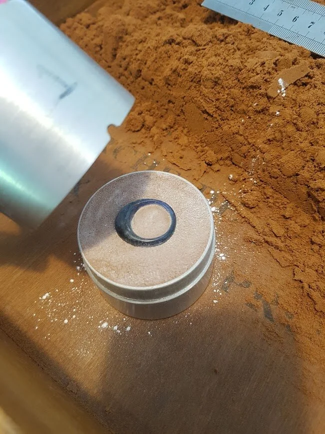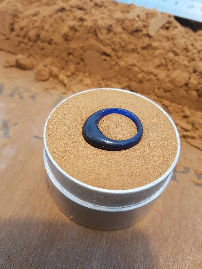 A pouring hole is carved from the sand on the top half of the mould and the two sides are joined back together. The molten silver can flow through this into the empty ring shape that has been made in between the two sides.