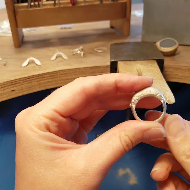 This is when you need to put some work in. It’s a satisfying part of the process, but quite hard work. First you need to file down any lumps and bumps including where the sprue was attached. There’s a special technique to this that makes sure you don’t take too much silver off in the wrong place and helps you stay on track. Again, something I don’t really know that much about, but Rose does!